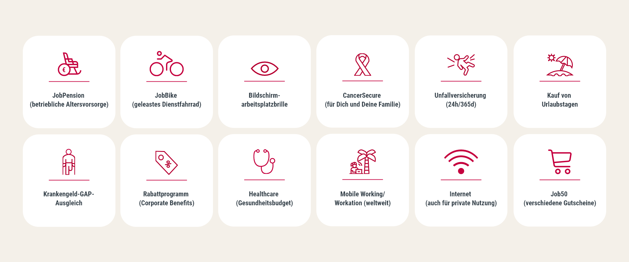 Mit unserer CultureDNA runden wir das Gesamtpaket ab und bieten Dir ein attraktives Vergütungsmodell, welches zudem eine Vielzahl von JobGoodies und JobBenefits beinhaltet.